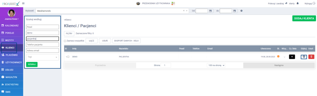 Z bocznego menu wybierz zakładkę KLIENCI, w kolejnym kroku wyszukaj danego pacjenta. Następnie wybierz ikonę Edytuj.
