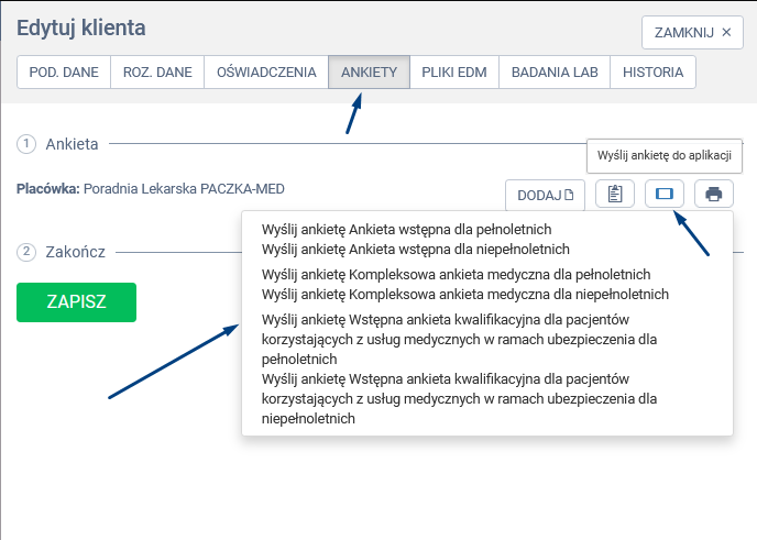 W zakładce „ANKIETY” kliknij w ikonę „Wyślij ankietę do aplikacji”, następnie wybierz odpowiednią ankietę i określ jej rodzaj (wyślij ankietę dla pełnoletnich lub wyślij ankietę dla niepełnoletnich).