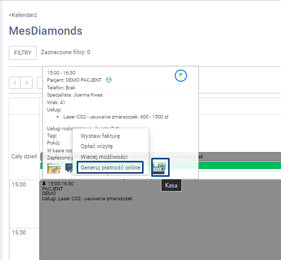 Możesz w dowolnym momencie wygenerować link do płatności online dla konkretnego pacjenta. Aby to zrobić należy wybrać zakładkę KALENDARZ w bocznym menu, a następnie kliknąć na konkretną wizytę. W oknie informacyjnym do wizyty kliknij w ostatnią ikonkę poniżej (kasa) i wybierz opcję „generuj płatność on-line”.