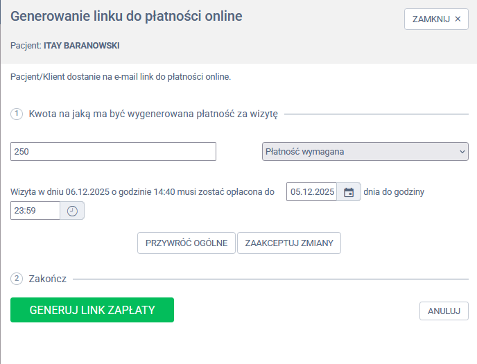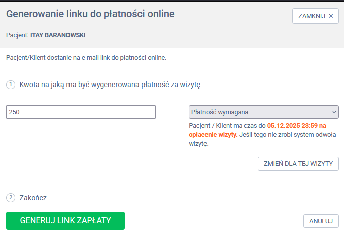 - Termin płatności przy generowaniu linku jest ustalany automatycznie na podstawie konfiguracji płatności dla danej wizyty:
