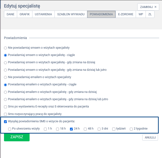 ⚠️ Istnieje możliwość wyboru kilku z tych opcji jednocześnie, np. SMS może być wysyłany 24h przed wizytą oraz w momencie utworzenia wizyty.