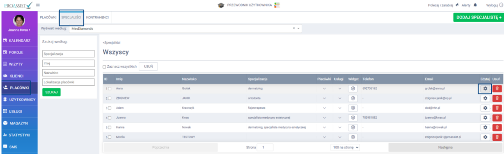 Aby włączyć opcję wysyłania wiadomości SMS z przypomnieniem o wizycie, wybierz PLACÓWKI w bocznym menu, a następnie kliknij zakładkę SPECJALIŚCI w górnym menu. Wybierz ikonkę edycji widoczną przy danym specjaliście.