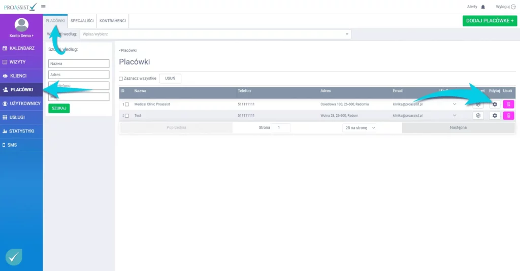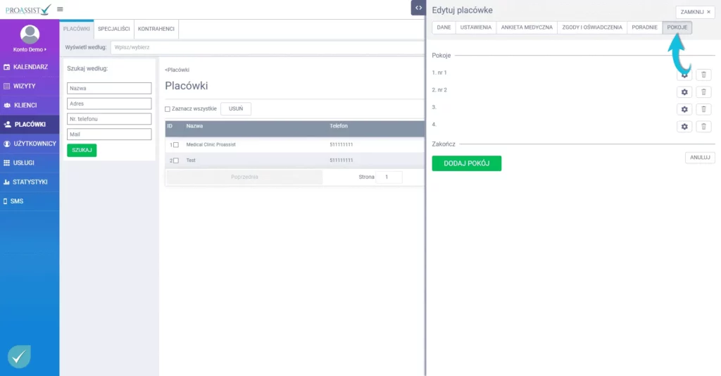 Aby dodać nowe pokoje, wybierz PLACÓWKI z bocznego menu, a następnie kliknij ikonkę edycji przy wybranej placówce.