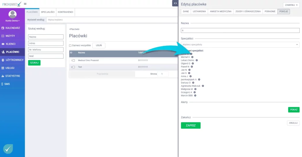 Przypisz specjalistów, którzy będą przyjmować pacjentów w danym pokoju, wybierając ich z listy. Usunąć dodanego lekarza możesz, klikając kółeczko z „x” obok jego nazwiska.