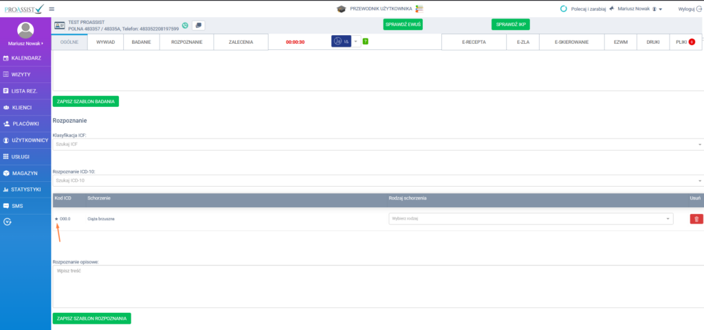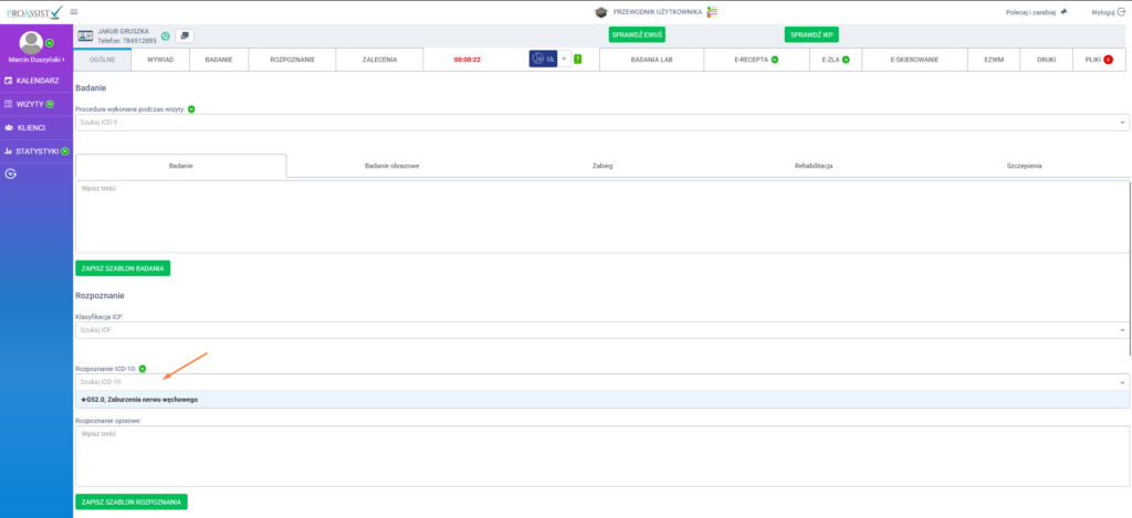 Od tej pory, po dodaniu procedury ICD-10 do ulubionych, podczas wyboru rozpoznania wystarczy kliknąć w pole wyszukiwania w sekcji Rozpoznanie. System automatycznie wyświetli listę zapisanych ulubionych procedur ICD-10, bez konieczności wpisywania kodu lub nazwy procedury.