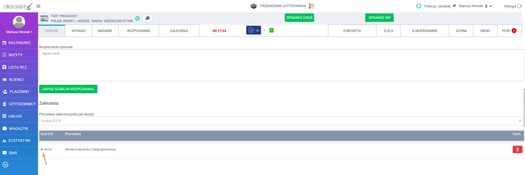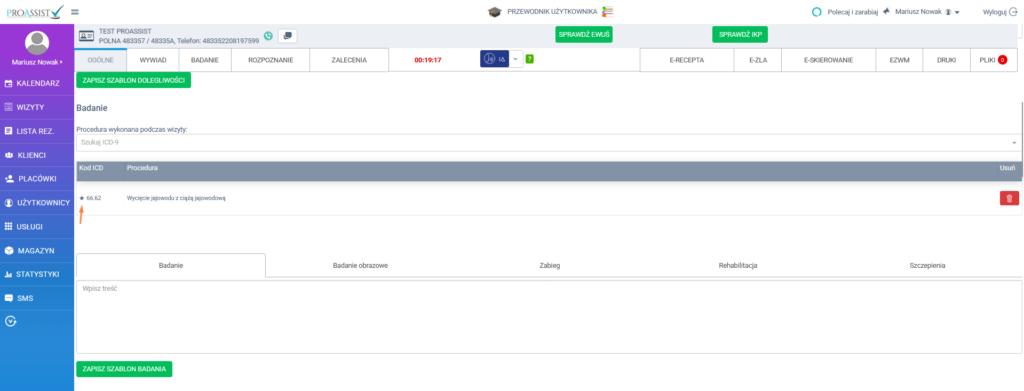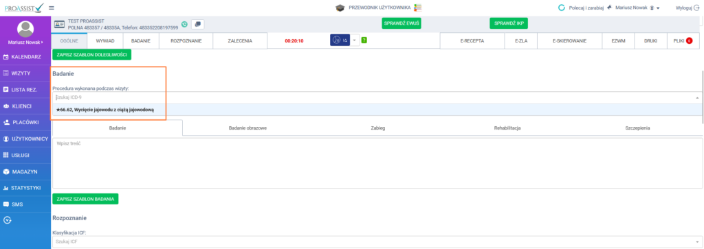 Ulubione procedury są zapisywane indywidualnie dla każdego użytkownika i dostępne wyłącznie z poziomu konta, na którym zostały dodane. Ta sama lista ulubionych ICD-9 jest dostępna zarówno w sekcji Badanie, jak i w sekcji Zalecenia, dzięki czemu użytkownik może szybko wybierać swoje procedury niezależnie od miejsca ich użycia.
