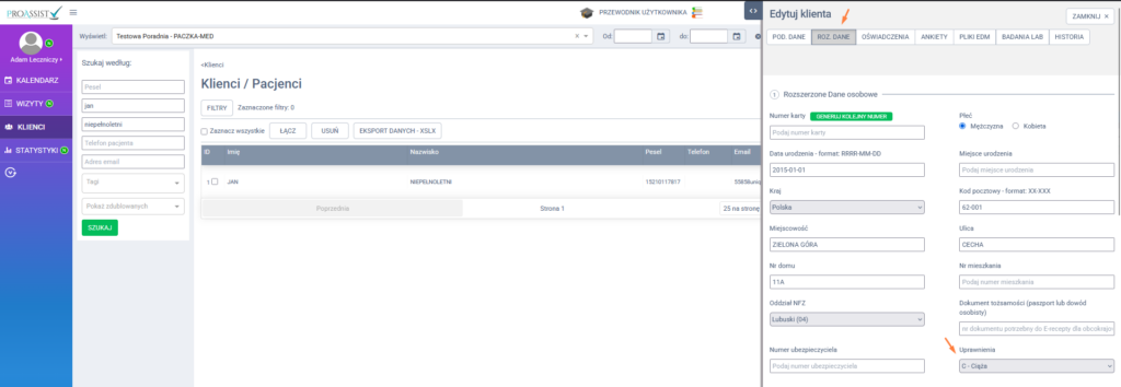 Uprawnienia można dodać z kilku miejsc w systemie, wszędzie tam, gdzie dostępna jest karta pacjenta.