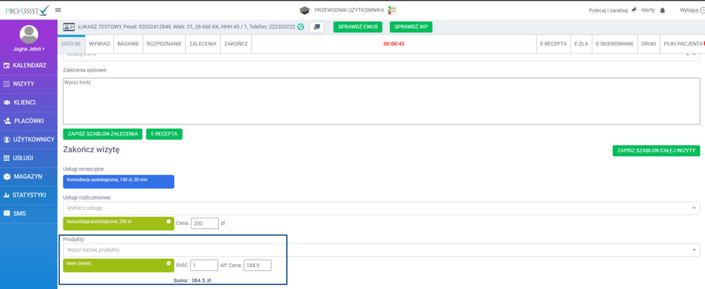 specjalista w oknie przeprowadzania wizyty w sekcji ZAKOŃCZ WIZYTĘ dokonuje wyboru odpowiedniego produktu z listy. Oczywiście może dokonać modyfikacji ceny oraz ilości sprzedawanego produktu.