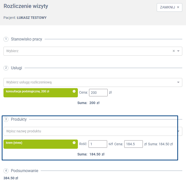 po kliknięciu w KASĘ -> WIĘCEJ MOŻLIWOŚCI, w oknie rozliczenia wizyty należy w punkcie 3 wybrać odpowiednie produktu, które kupuje pacjent podczas realizacji wizyty. Oczywiście może dokonać modyfikacji ceny oraz ilości sprzedawanego produktu.