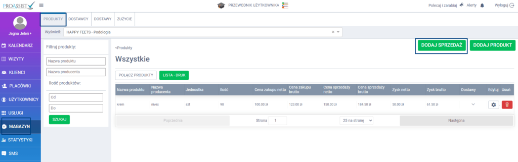 – w zakładce MAGAZYN -> PRODUKTY: kliknij w zieloną zakładkę DODAJ SPRZEDAŻ.