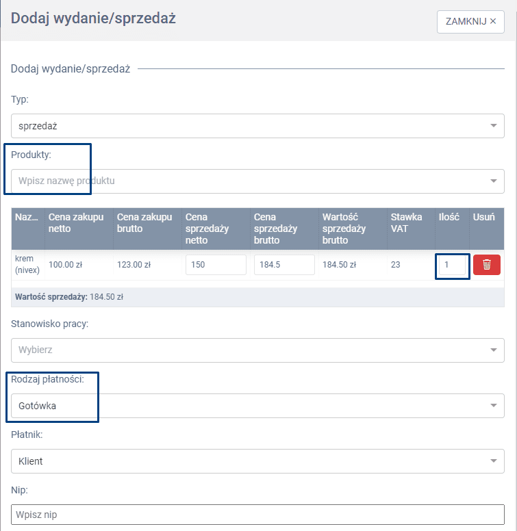 W panelu bocznym wysuwanym określ produkt, wprowadzając nazwę produktu w sekcji Produkty, kliknij enter by wyszukać danego produktu. W kolejnym kroku określ ilość sprzedawanego produktu. Możesz modyfikować cenę. Określ formę płatności, oraz w razie potrzeby uzupełnij notatkę.
