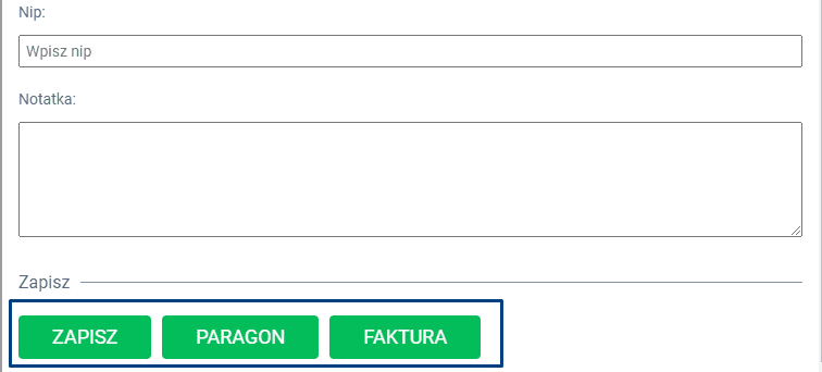 Jeżeli sprzedaż kończyć wydrukiem paragonu wybierz odpowiednią drukarkę w sekcji “Stanowisko pracy”. Jeśli na paragonie dodatkowo ma się pojawić NIP, wpisz odpowiedni numer w sekcji “NIP”.