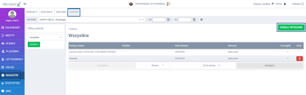 – w zakładce MAGAZYN -> ZUŻYCIE: kliknij w zieloną zakładkę DODAJ WYDANIE.