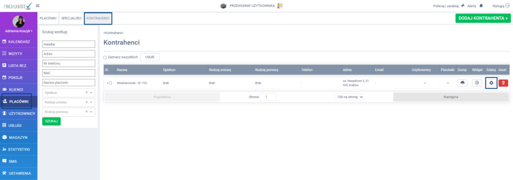 Aby dopasować pola wyświetlane w formularzu do rejestracji online, wybierz z bocznego menu zakładkę PLACÓWKI, a następnie z górnego KONTRAHENCI. Przy konkretnym kontrahencie kliknij w ikonę edycji.