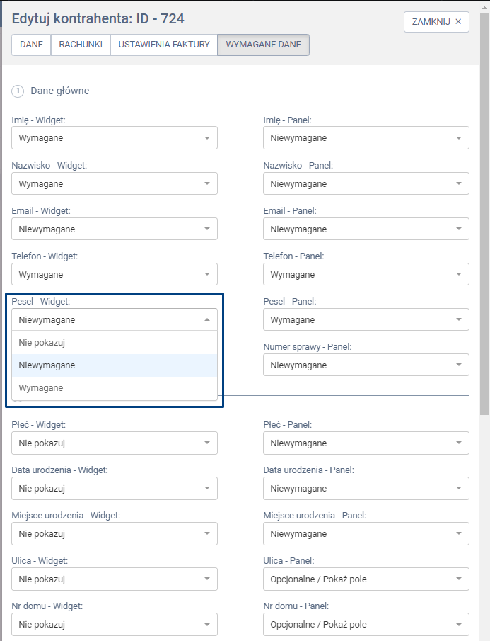 W panelu bocznym wysuwanym wybierz zakładkę WYMAGANE DANE. Przy konkretnych nazw pól po lewej stronie – pola z dopiskiem „Widget” określ odpowiedni rodzaj wyświetlania lub jego brak. Wprowadzone dane zatwierdź klikając w zieloną zakładkę ZAPISZ.