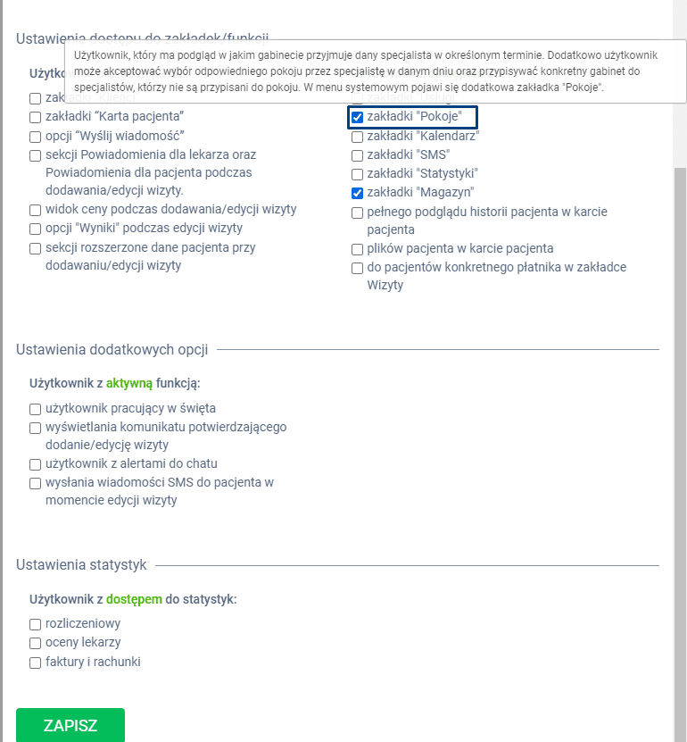 W panelu bocznym wysuwanym wybierz zakładkę DOSTĘP I FUNKCJE, a następnie w sekcji “Ustawienia dodatkowych opcji”, kolumnie “Użytkownik z dostępem do:” kliknij w checkbox: “zakładki „Pokoje”.