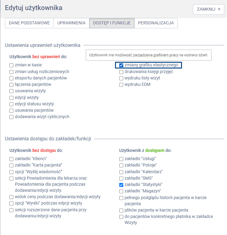 W panelu bocznym wysuwanym wybierz zakładkę DOSTĘP I FUNKCJE, a następnie w sekcji “Ustawienia statystyk”, kolumnie “Użytkownik z uprawnieniami do:” kliknij w checkbox: “zmiany grafiku elastycznego”.