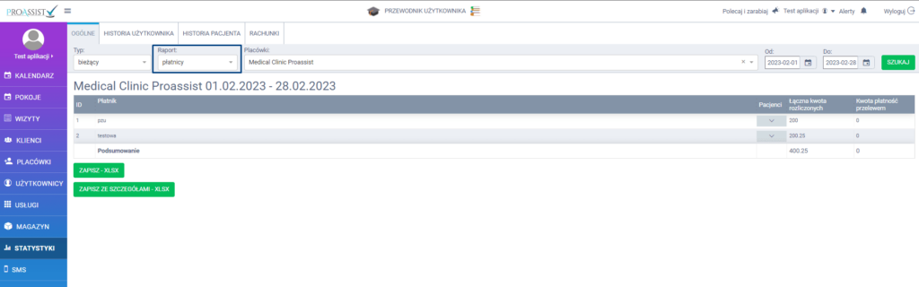 W celu wygenerowania raportu dot. płatników, w tym celu z bocznego menu kliknij w zakładkę STATYSTYKI -> określ typ raportu jako PŁATNICY -> wybierz placówkę z listy -> określ zakres dat za jaki chcesz wygenerować odpowiedni raport -> by wyświetlić raport kliknij w SZUKAJ.