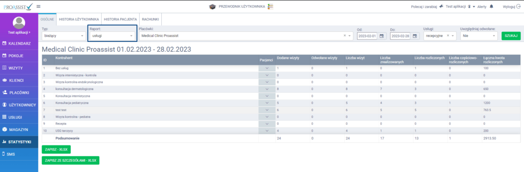 W celu wygenerowania raportu dot. usług, w tym celu z bocznego menu kliknij w zakładkę STATYSTYKI -> określ typ raportu jako USŁUGI -> wybierz placówkę lub specjalistę z listy -> określ zakres dat za jaki chcesz wygenerować odpowiedni raport -> wybierz odpowiedni rodzaj usług -> a następnie określ czy w rozliczeniu chcesz uwzględniać wizyty odwołane -> by wyświetlić raport kliknij w SZUKAJ.
