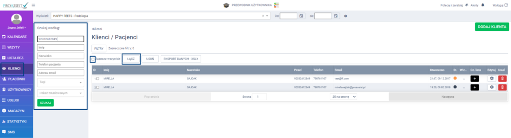 Jeżeli chcesz połączyć karty pacjentów w tym celu przejdź do zakładki KLIENCI z bocznego menu, a następnie wyszukaj zdublowane karty po wspólnych danych, np. wpisując nr pesel. Aby system wyświetlił odpowiednie karty, kliknij w zieloną zakładkę SZUKAJ.