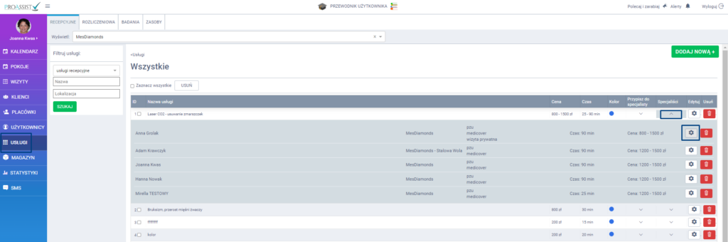 Aby połączyć usługi ze sobą należy wybrać z bocznego menu zakładkę USŁUGI. W kolejnym kroku wyszukaj odpowiedniej usługi z listy. Przy konkretnej usłudze kliknij w „V” w kolumnie Specjaliści. Następnie kliknij w ikonę edycji przy konkretnym specjaliście.