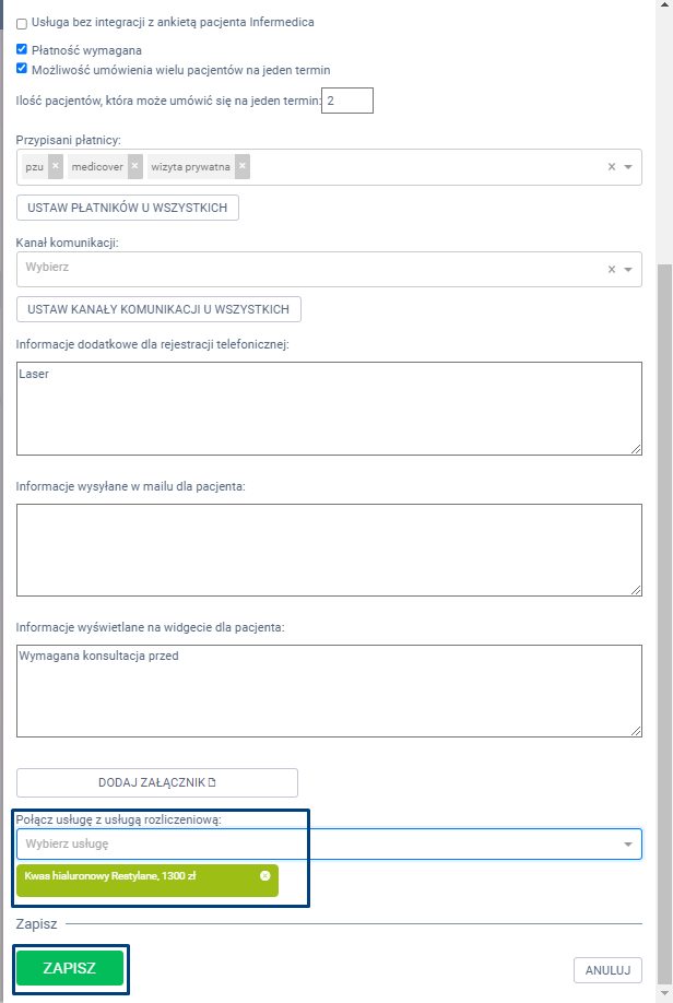 W w oknie edycji usługi recepcyjnej, na samym dole w sekcji Połącz usługę z usługą rozliczeniową wybierz usługę rozliczeniową z listy. prowadzone dane zatwierdź klikając w zieloną zakładkę ZAPISZ.
