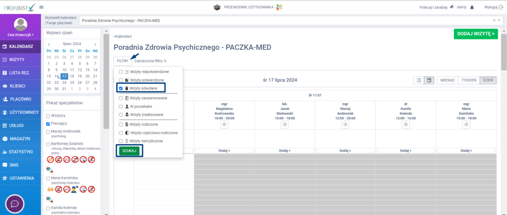 Jeżeli wiesz na jaki termin był umówiony dany pacjent, możesz wyszukać go za pomocą filtrów bezpośrednio z kalendarza. W tym celu nad kalendarzem kliknij w opcję FILTRY. Na liście wszystkich statusów, wybierz Wizyty odwołane. Następnie kliknij w zieloną zakładkę SZUKAJ.