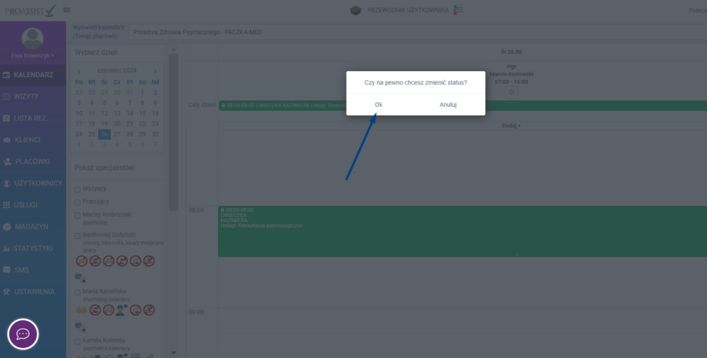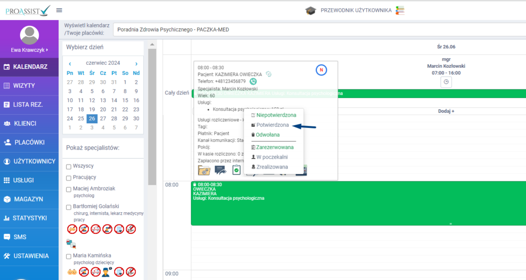 W ten sposób wizyta odwołana, zostanie zmieniona na wizytę ze statusem aktywnym – potwierdzonym.