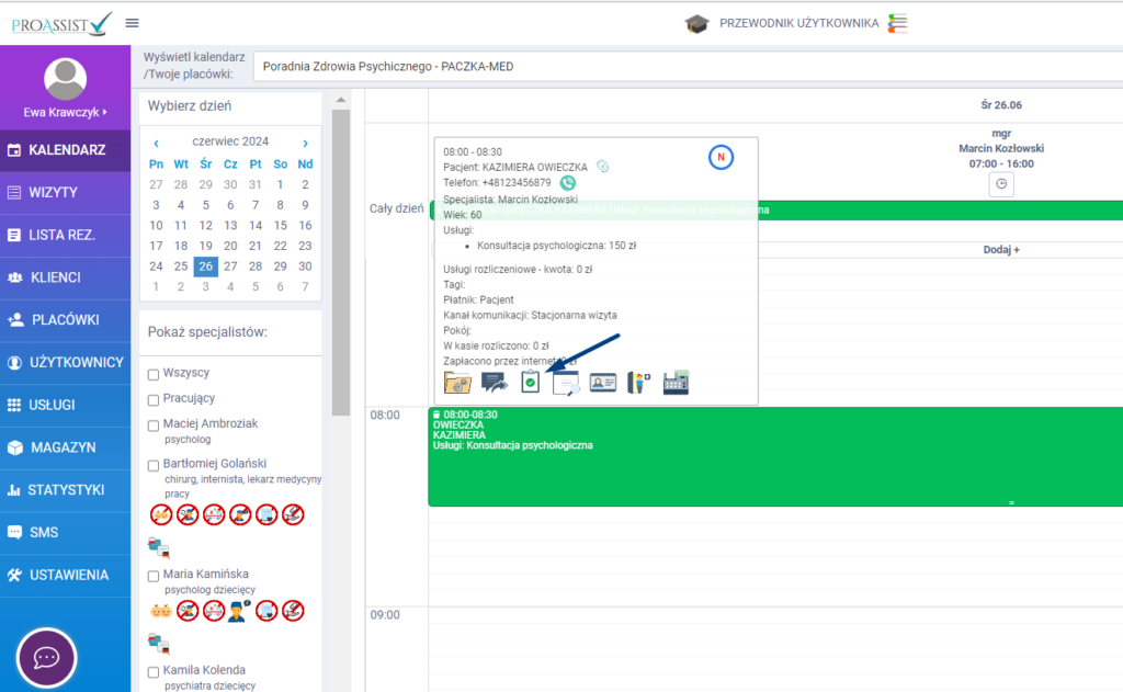 Kliknij w daną rezerwację, której chcesz zmienić status z wizyty odwołanej na wizytę aktywną. W kolejnym kroku w oknie informacyjnym do wizyty kliknij w ikonę „Zmień status”.