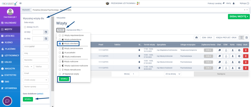 W kolejnym kroku kliknij w zakładkę FILTRY, a następnie z listy wybierz status wizyty odwołane. Zatwierdź zakładką SZUKAJ.