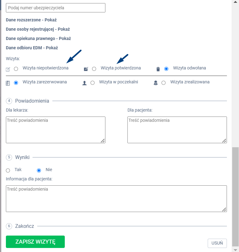 W panelu bocznym wysuwanym – w oknie Edytuj wizytę, pod danymi osobowymi pacjenta kliknij w opcję Wizyta potwierdzona lub Wizyta nie potwierdzona. Wprowadzone dane zatwierdź klikając w zieloną zakładkę ZAPISZ WIZYTĘ.