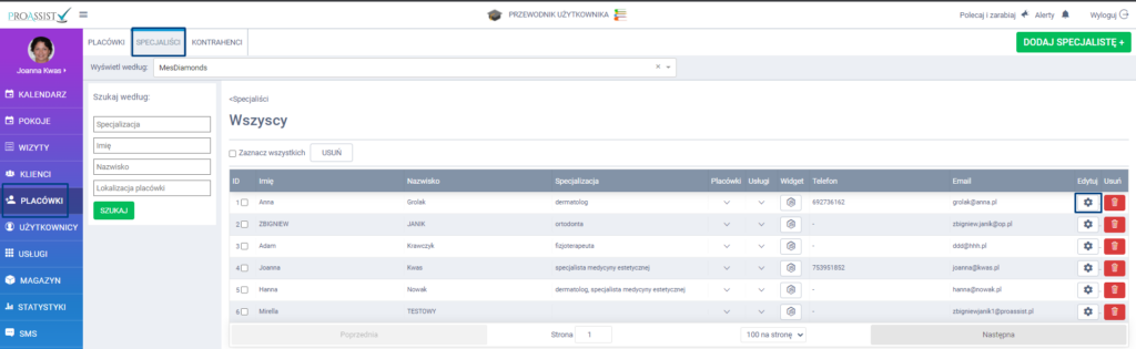 Aby uruchomić tę opcję kliknij w zakładkę PLACÓWKI z bocznego menu, następnie z górnego menu wybierz zakładkę SPECJALIŚCI. Wyszukaj odpowiedniego specjalisty na liście, a następnie kliknij w ikonę edycji.