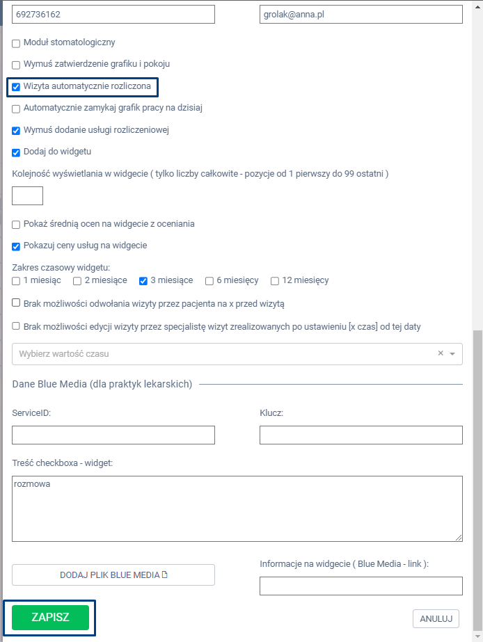 Aby zapisać te informacje w systemie kliknij w zieloną zakładkę ZAPISZ.