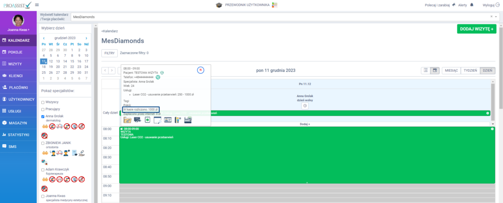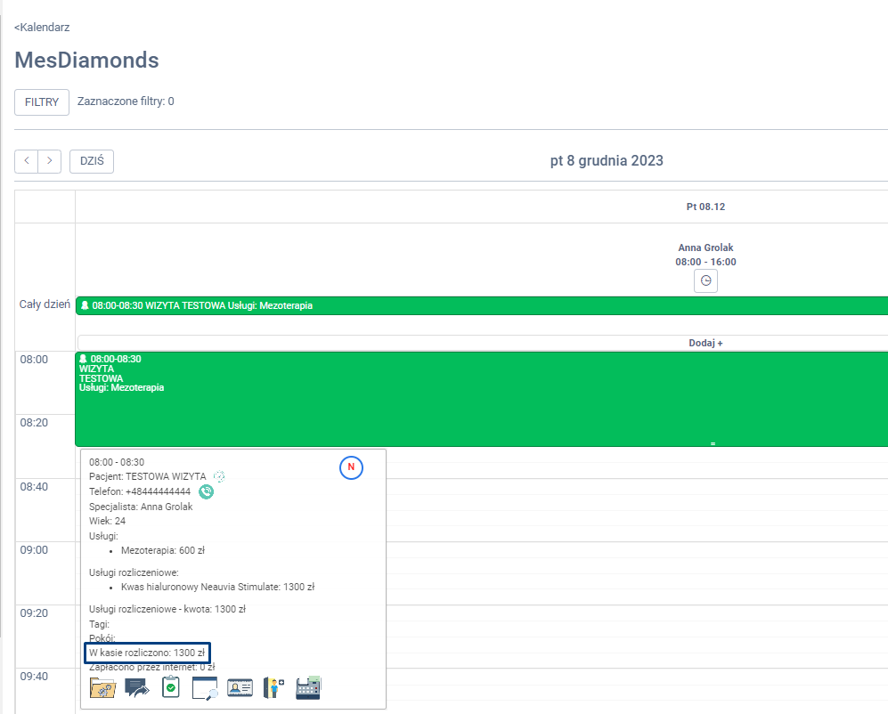Wizyta zmieni swój kolor na zielony oraz będzie widoczna kwota rozliczenia w oknie informacyjnym do wizyty.