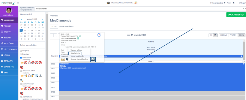 System Proassist może automatycznie rozliczać wizytę, po wypełnieniu dokumentacji medycznej przez specjalistę. W momencie gdy specjalista zakończy wizytę, czyli kliknie w jedną z trzech zielonych zakładek w oknie przeprowadzania wizyty, tj. ZAPISZ I ZAKOŃCZ, ZAPISZ I DRKUJ lub ZAPISZ I WYŚLIJ EMAIL system zmieni status wizyty na rozliczoną. Wizyta zmieni swój kolor na zielony oraz będzie widoczna kwota rozliczenia w oknie informacyjnym do wizyty.