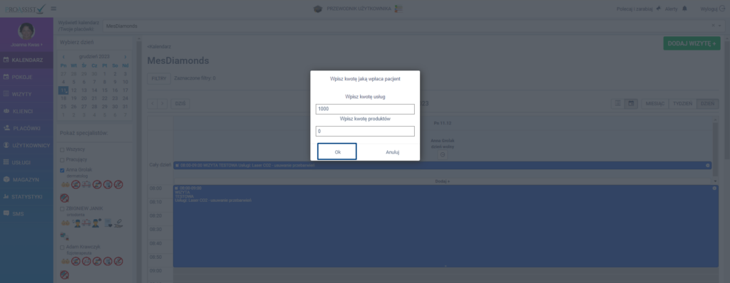 Rozliczenie wizyty jako zaznaczenie w systemie informacji na temat kwoty pobranej od pacjenta #