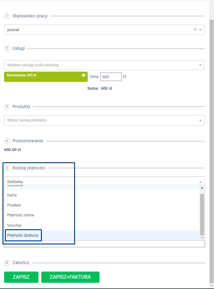 W oknie „Rozliczenie wizyty” w sekcji „Rodzaj płatności” wybierz z selektów „Płatność dzielona”.