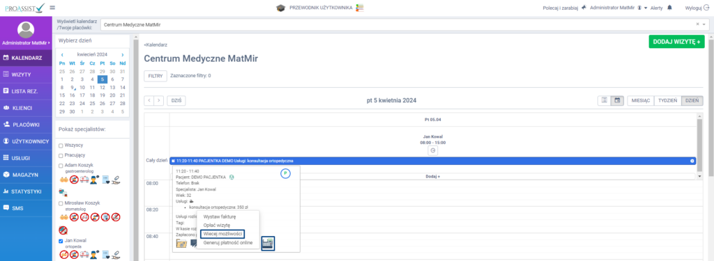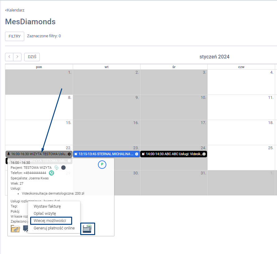 Kliknij w daną rezerwację, w oknie informacyjnym do wizyty wybierz ikonę kasy, a następnie więcej możliwości.