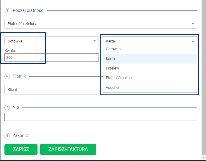 W kolejnym kroku wybierz odpowiednie rodzaje płatności z listy i do każdego z nich określ kwotę.
