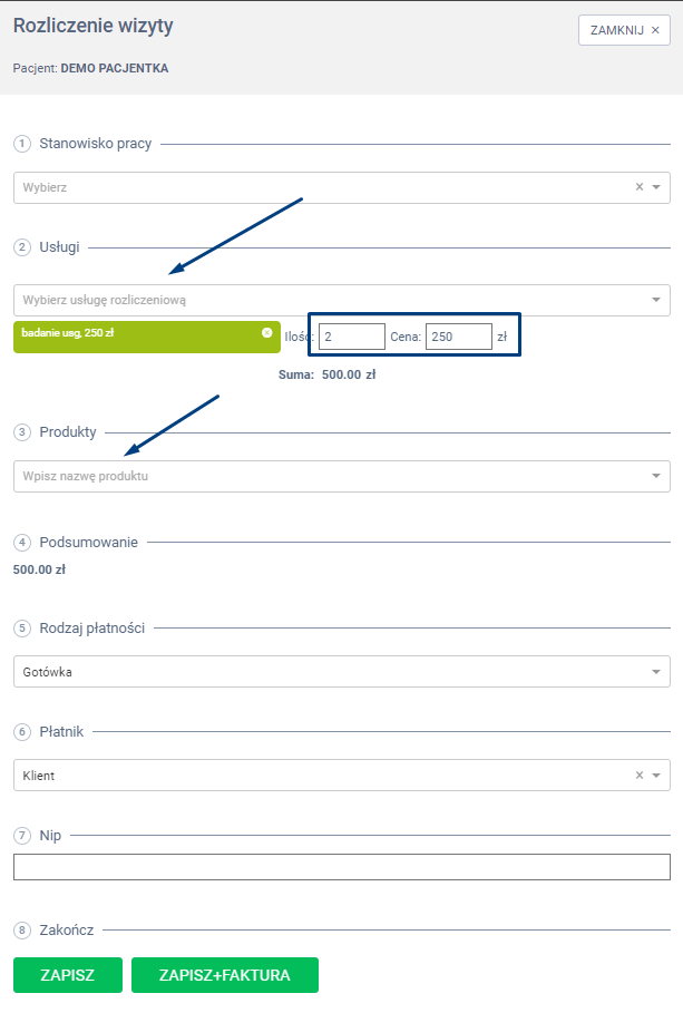 W oknie rozliczenia wizyty w punkcie 2 wybierz usługę rozliczeniową. Możesz w tym miejscu dokonać modyfikacji kwoty za daną usługę, a także ilości. Jeżeli dokonano sprzedaży produktu, wybierz odpowiedni produkt w punkcie 3.