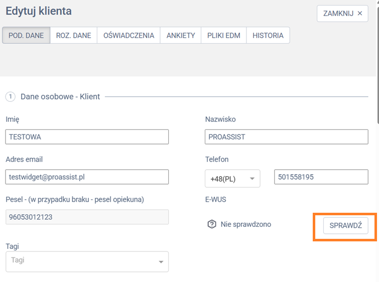 - Sposób: w karcie pacjenta, w sekcji E-WUS dostępna jest zakładka SPRAWDŹ, która pozwala na weryfikację ubezpieczenia pacjenta. Aby móc sprawdzać e-WUŚ w karcie pacjenta, należy uruchomić taką możliwość konkretnemu użytkownikowi.
