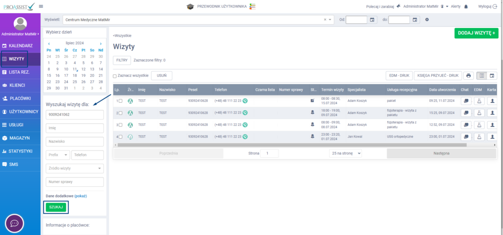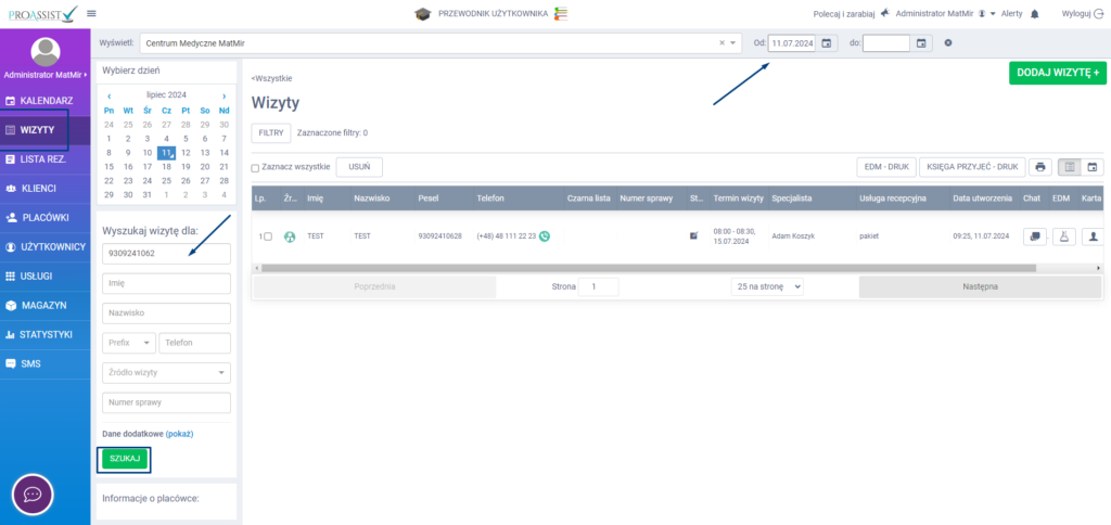W takim przypadku najlepiej przejdź do zakładki WIZYTY z bocznego menu, a następnie skorzystaj z wyszukiwarki wprowadzając odpowiednie dane pacjenta. Po wpisaniu danych zatwierdź wyszukiwanie poprzez kliknięcie w zakładkę SZUKAJ.