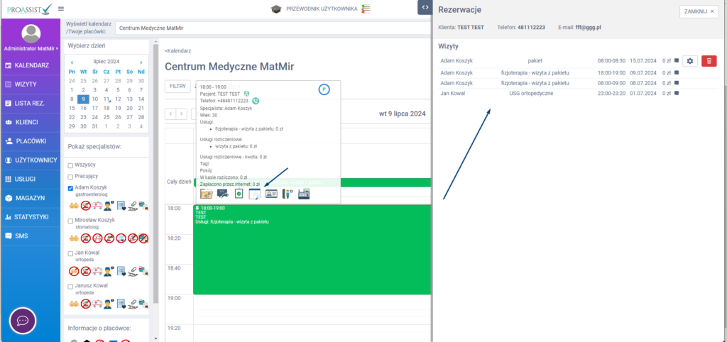 oczywiście wraz z informacją o opłaconej kwocie za poprzednie wizyty, a także z możliwością zarządzania zaplanowanymi rezerwacjami (zmiana terminu lub odwołanie).