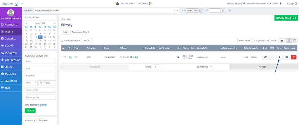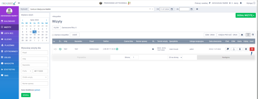 System wyświetli rezerwacje pacjenta, zarówno te które się odbyły, jak i te zaplanowane na przyszłość. Możesz również filtrować wizyty na podstawie daty, tj. wyszukać rezerwacji umówionych od np. 11.07.2024. Dzięki temu zostanie przedstawiona lista tylko zaplanowanych rezerwacji od danego terminu wraz z dodatkowymi informacjami, w tym przypadku istotna usługa na jaką pacjent jest umówiony.