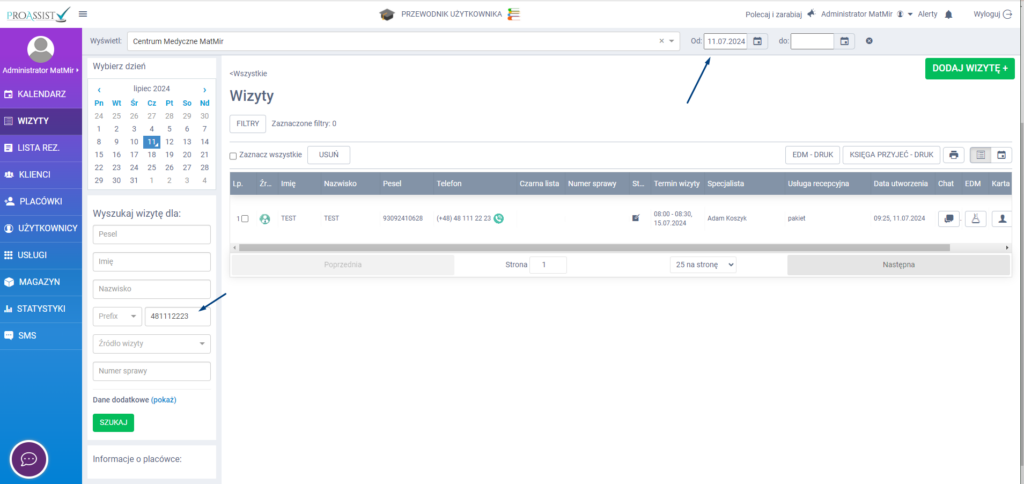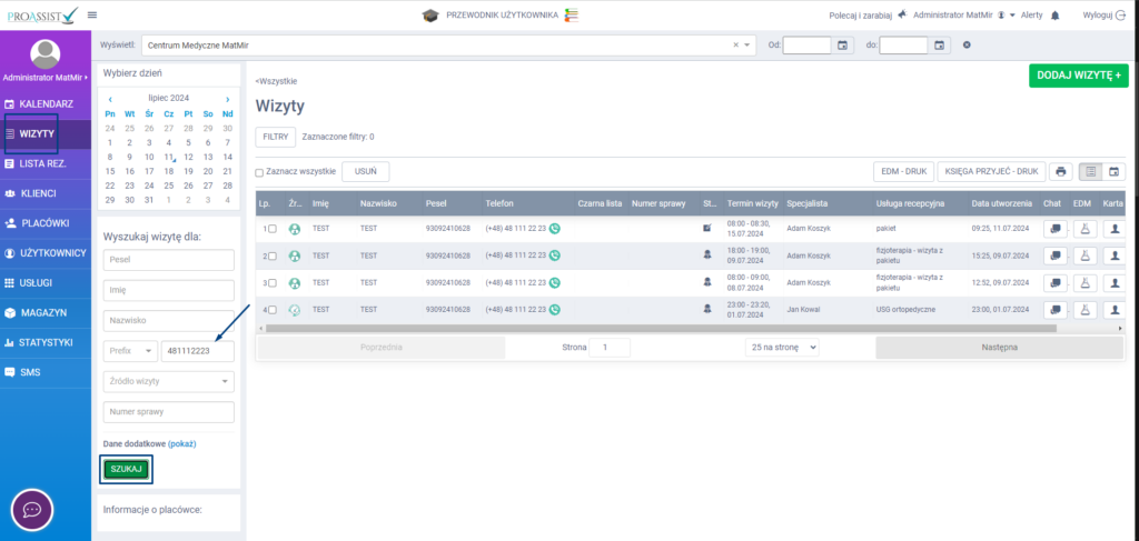 Jeżeli dzwoni do Ciebie pacjent i chcesz od razu po nr telefonu zlokalizować jego kartę wraz z informacją na jaką usługę jest zapisany, w tym celu z bocznego menu przejdź do zakładki WIZYTY. W kolejnym kroku skorzystaj z wyszukiwarki wprowadzając odpowiednie dane pacjenta – w tym przypadku nr telefonu. Po wpisaniu danych zatwierdź wyszukiwanie poprzez kliknięcie w zakładkę SZUKAJ.