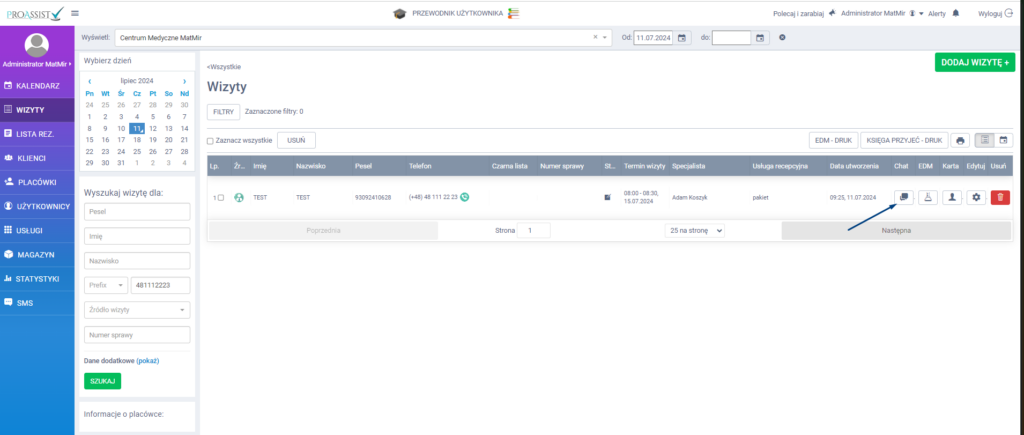- chatowanie z pacjentami za pomocą ikony chatu