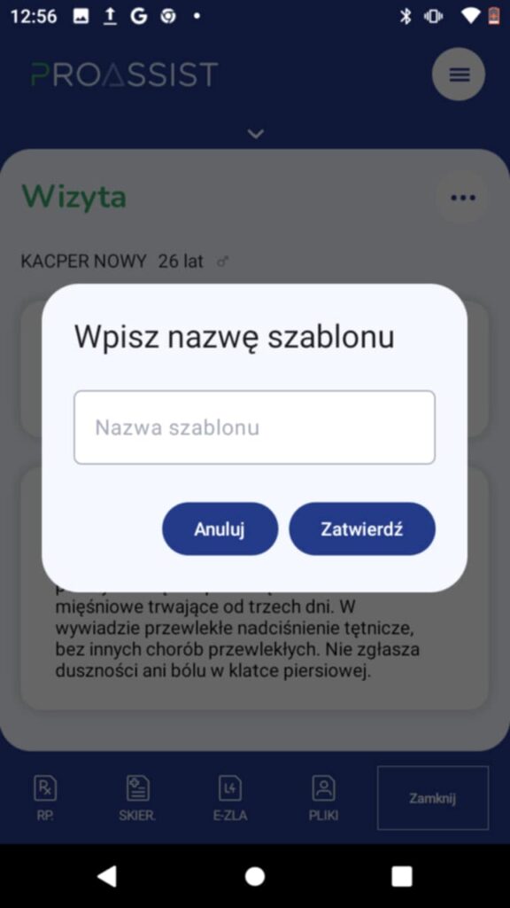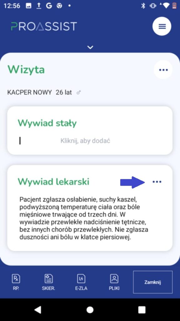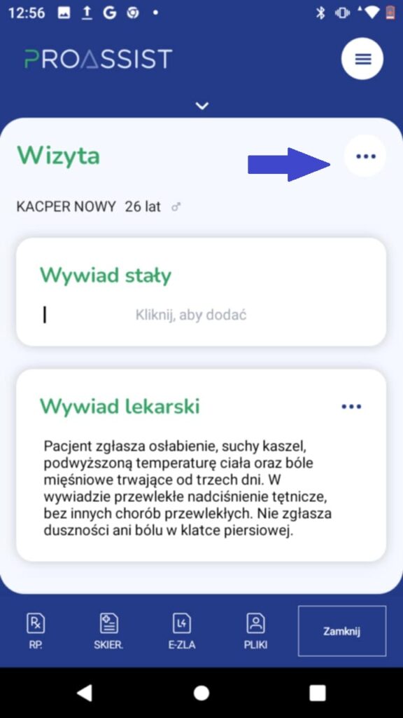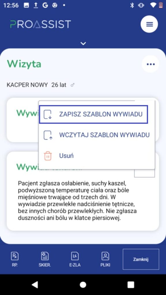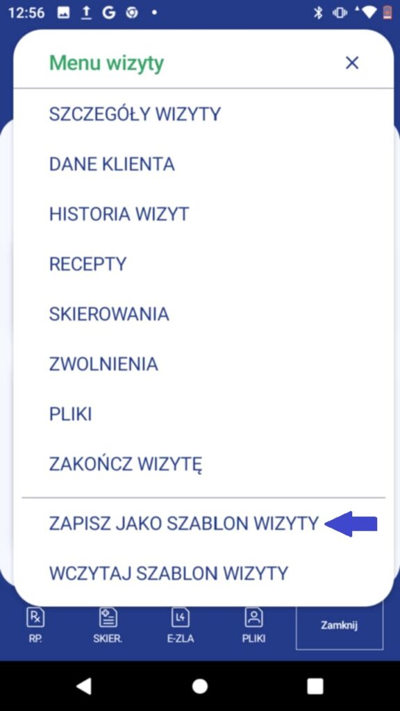 Jeżeli chcesz zapisać szablon całej wizyty, kliknij w menu wizyty, dostępne po kliknięciu w trzy poziome kropki w górnej części okna przeprowadzania wizyty.