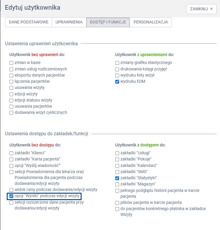 W panelu bocznym wysuwanym wybierz zakładkę DOSTĘP I FUNKCJE, a następnie w sekcji “Ustawienia dostępu do zakładek/funkcji”, kolumnie “Użytkownik z aktywną funkcją:” kliknij w checkbox: “opcji „Wyniki” podczas edycji wizyty”.