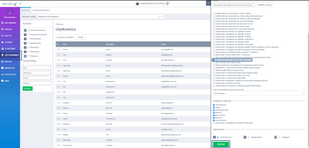 Jeżeli chcesz, aby użytkownik nie miał widocznych cen za usługi podczas dodawania lub edycji wizyty w tym celu z bocznego menu kliknij w zakładkę UŻYTKOWNICY, następnie w ikonę edycji przy konkretnym użytkowniku. W panelu bocznym wysuwanym zaznacz checkbox “Ukryj ceny podczas dodawania/edycji wizyty”.