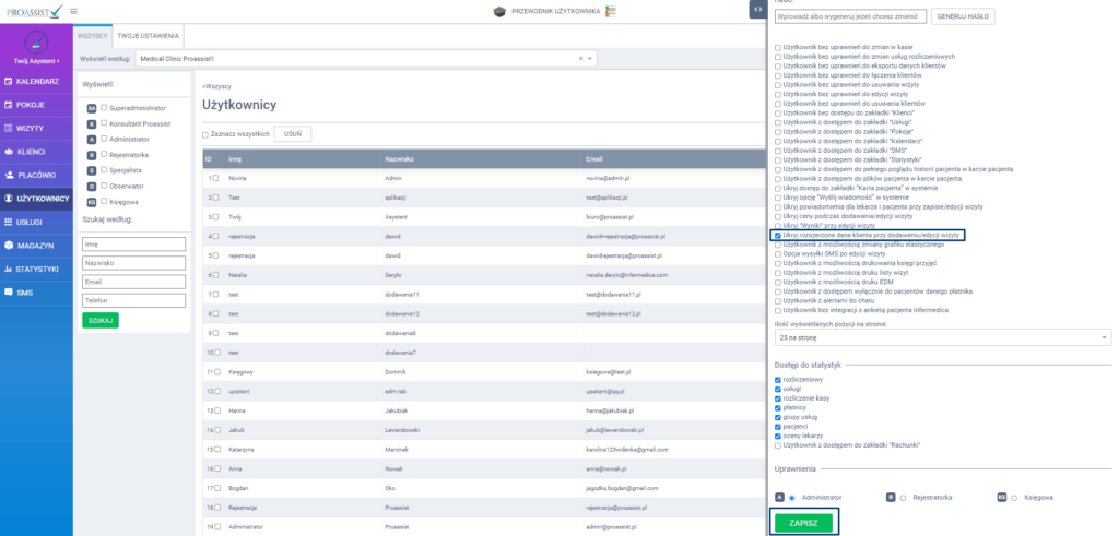 Jeżeli chcesz, aby użytkownik nie miał widocznej sekcji “Dane rozszerzone” podczas dodawania lub edycji wizyty w tym celu z bocznego menu kliknij w zakładkę UŻYTKOWNICY, następnie w ikonę edycji przy konkretnym użytkowniku. W panelu bocznym wysuwanym zaznacz checkbox “Ukryj rozszerzone dane pacjenta przy dodawaniu/edycji wizyty”.